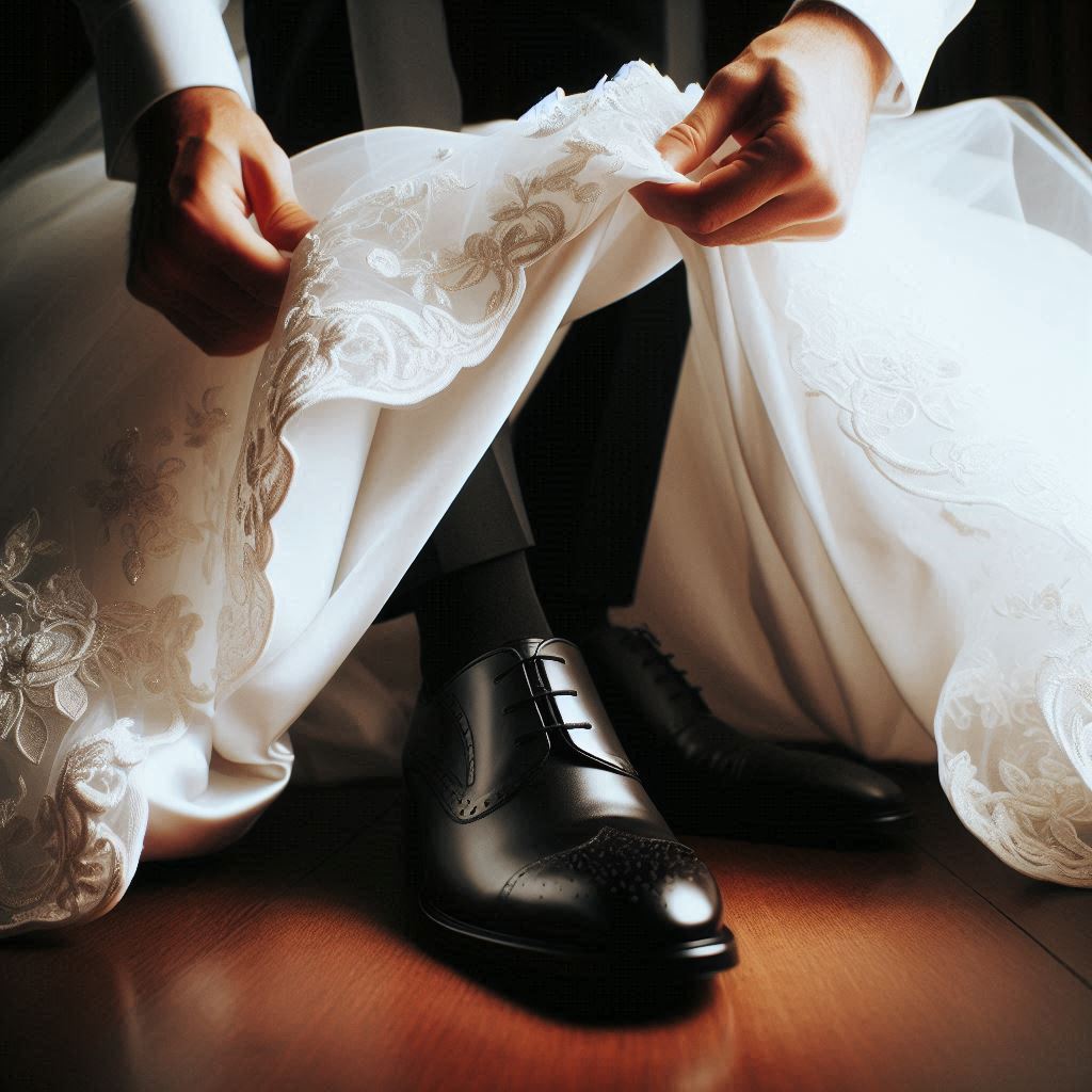 Beneath the delicate layers of satin and lace were not dainty bridal heels… but polished black men’s dress shoes.
