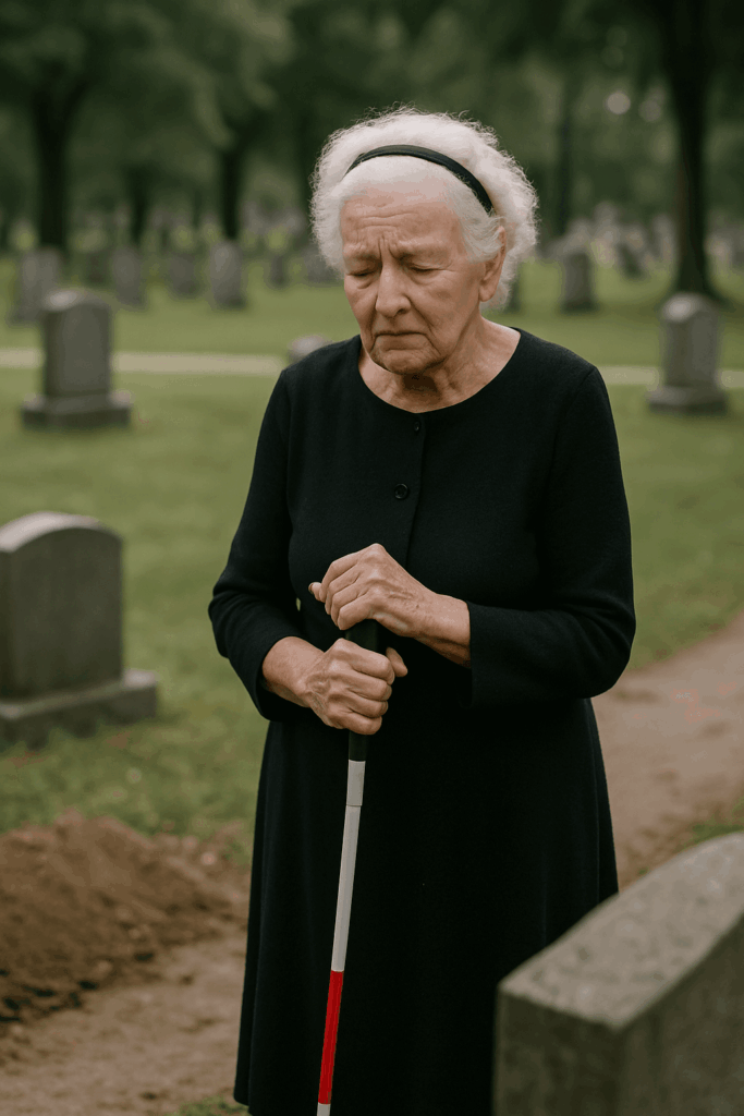 A few rows away, I noticed a thin, elderly woman standing quietly by a freshly dug grave. She wore a plain black dress and held a white cane tightly. She seemed lost and fragile.