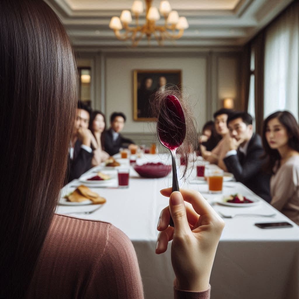 I took a bite and slowly paused. I made my face show just enough confusion—just enough surprise—before I reached into the sauce and carefully pulled out what looked like a hair.