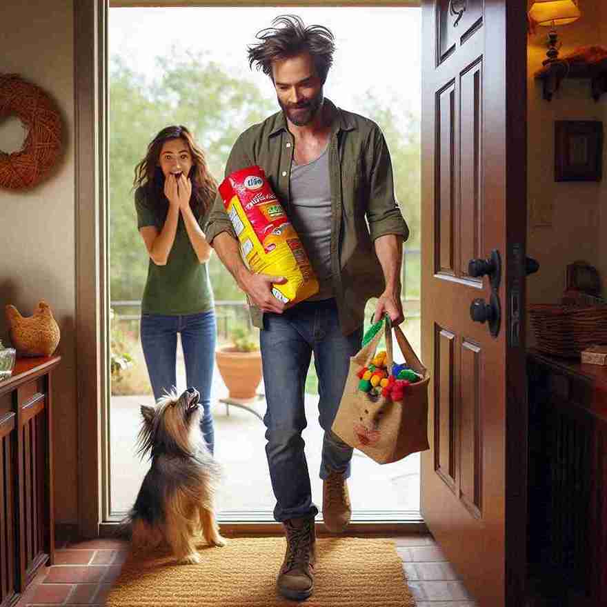Just then, the front door creaked open. Daniel stood there, messy hair and windblown, holding a bag of dog food and a squeaky toy.