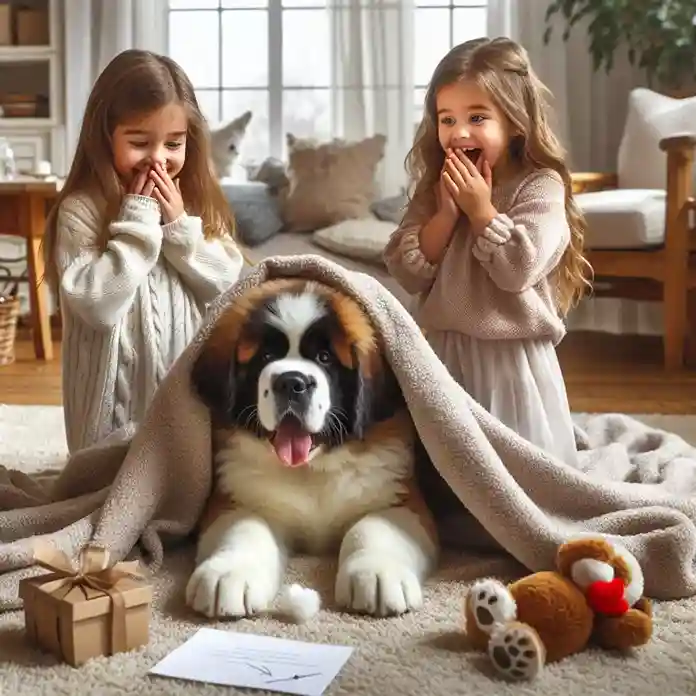 Lila helped unwrap the bundle, and out rolled a clumsy, fluffy puppy — a tiny St. Bernard with oversized paws and a wagging tail. The girls screamed with joy and hugged him instantly.