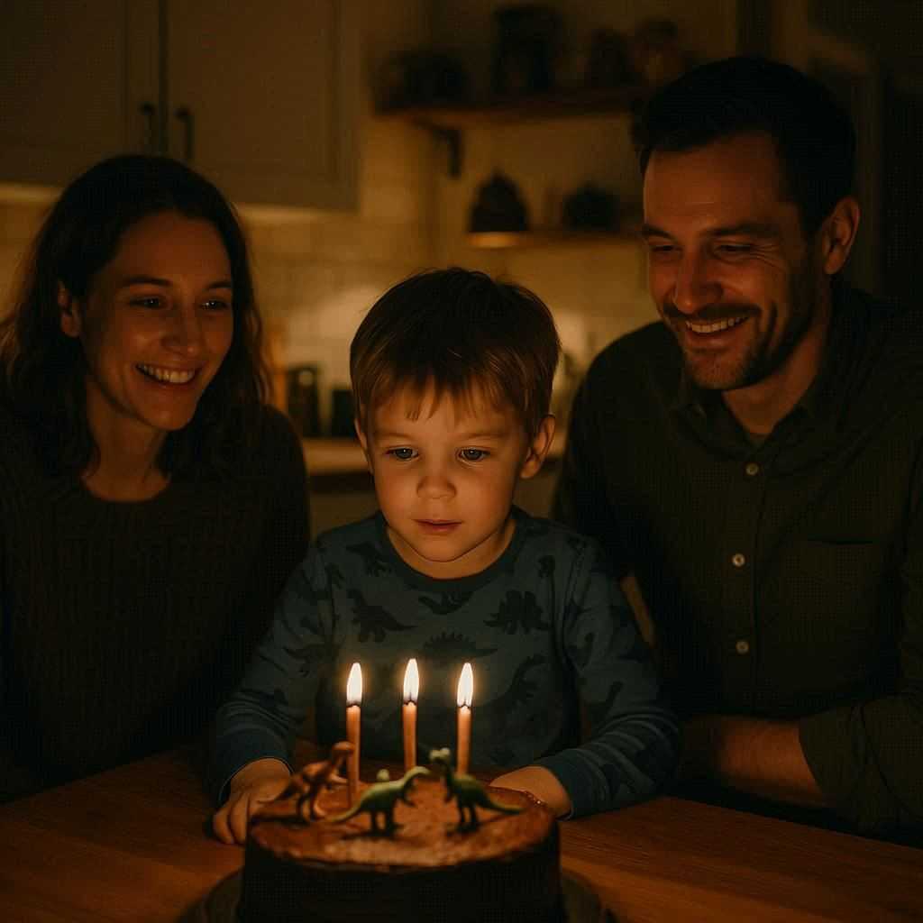 We kept it small: a chocolate cake with tiny plastic dinosaurs, the three of us gathered around the kitchen table. We sang “Happy Birthday,” off-key and happy. Eli stared at the candles, then looked up at us—really looked—and blew them out.