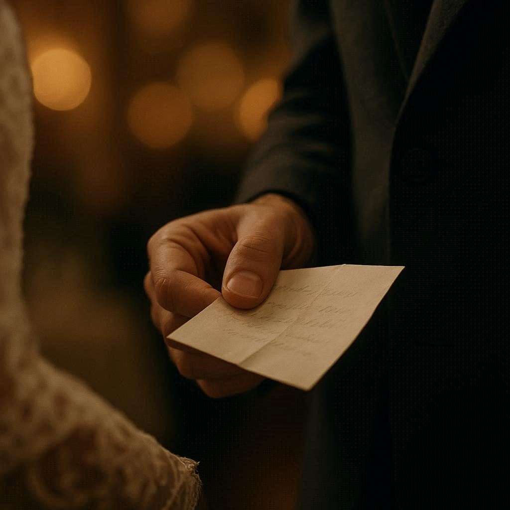 We took our seats at the reception table, hands intertwined. That’s when she slipped a folded note into my palm.