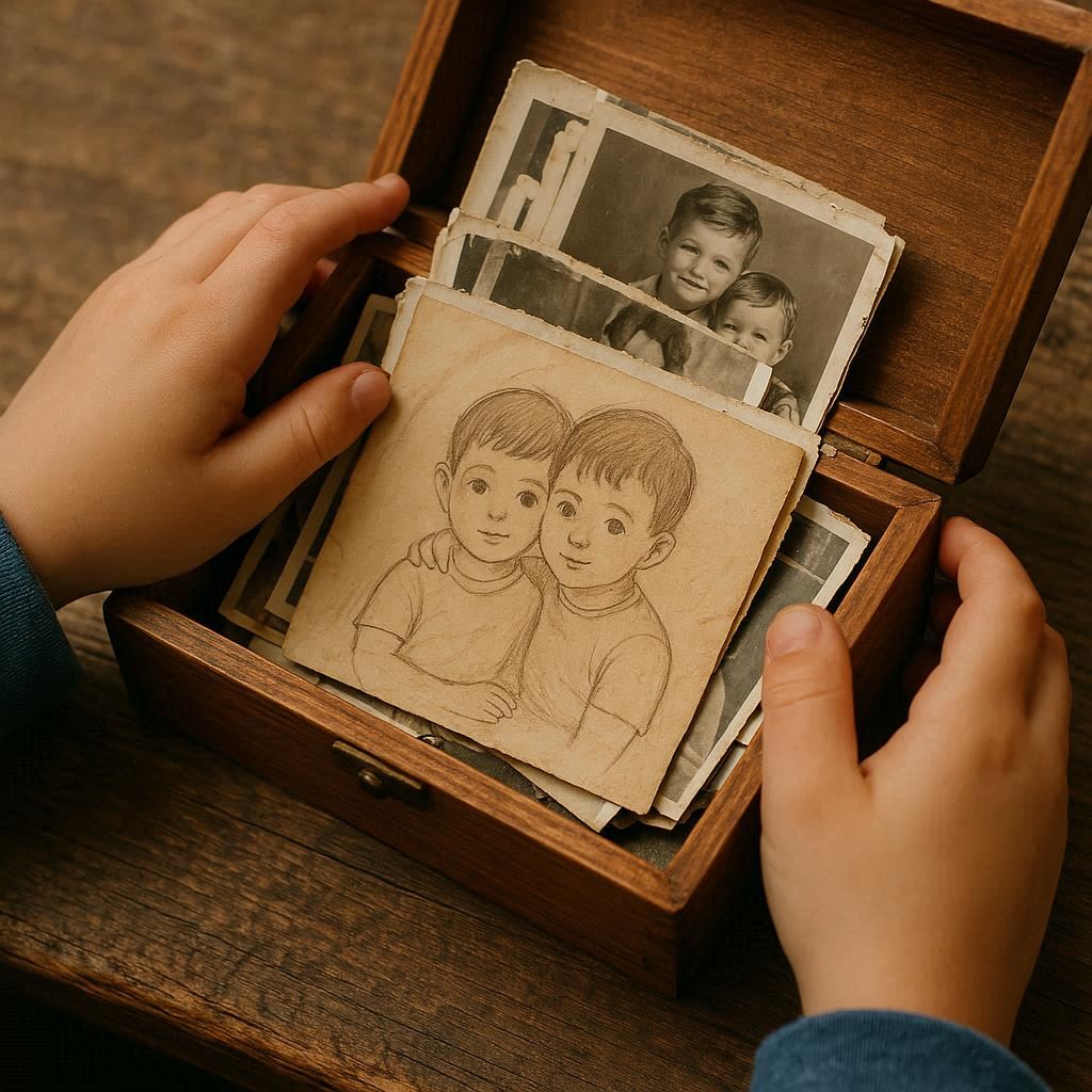Inside the box were faded photos and drawings—two little boys smiling together, swinging in a park. The resemblance between them was undeniable.