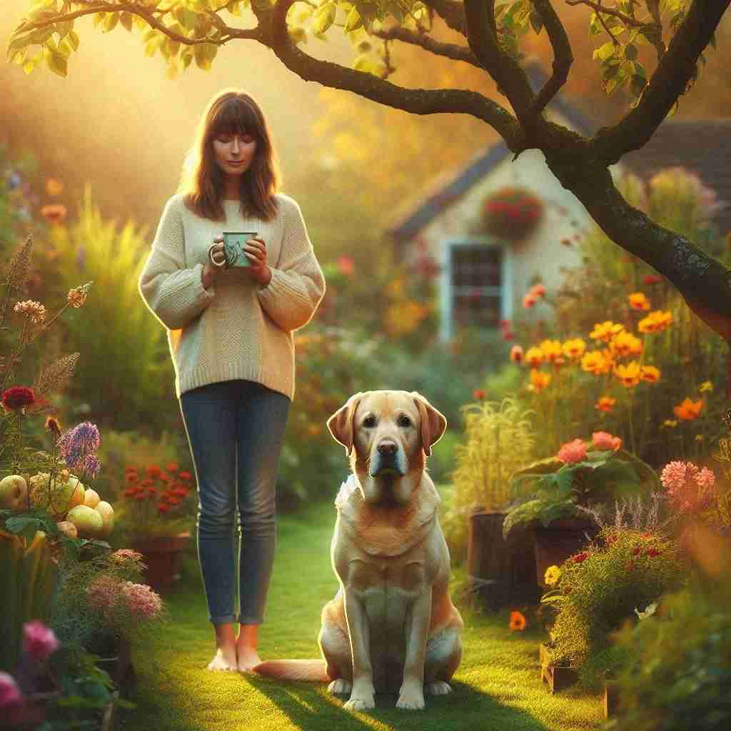 A big yellow Labrador sat calmly in her garden, as if he had been waiting for her. His fur was dusty, his breathing a bit labored, but his eyes were warm honey — gentle and patient.