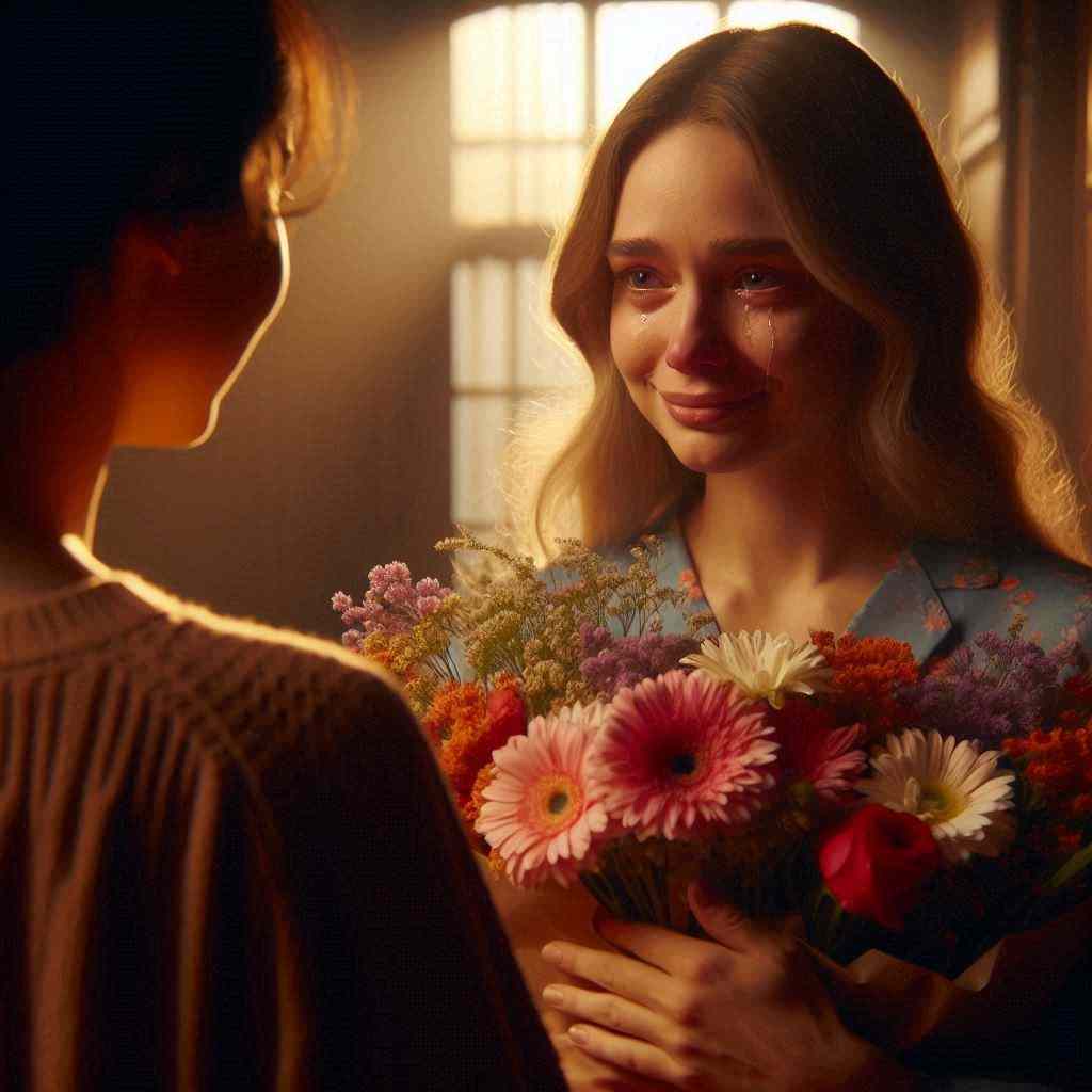 “Here they are! Thank you so much,” she said warmly, accepting the bouquet from his hands.