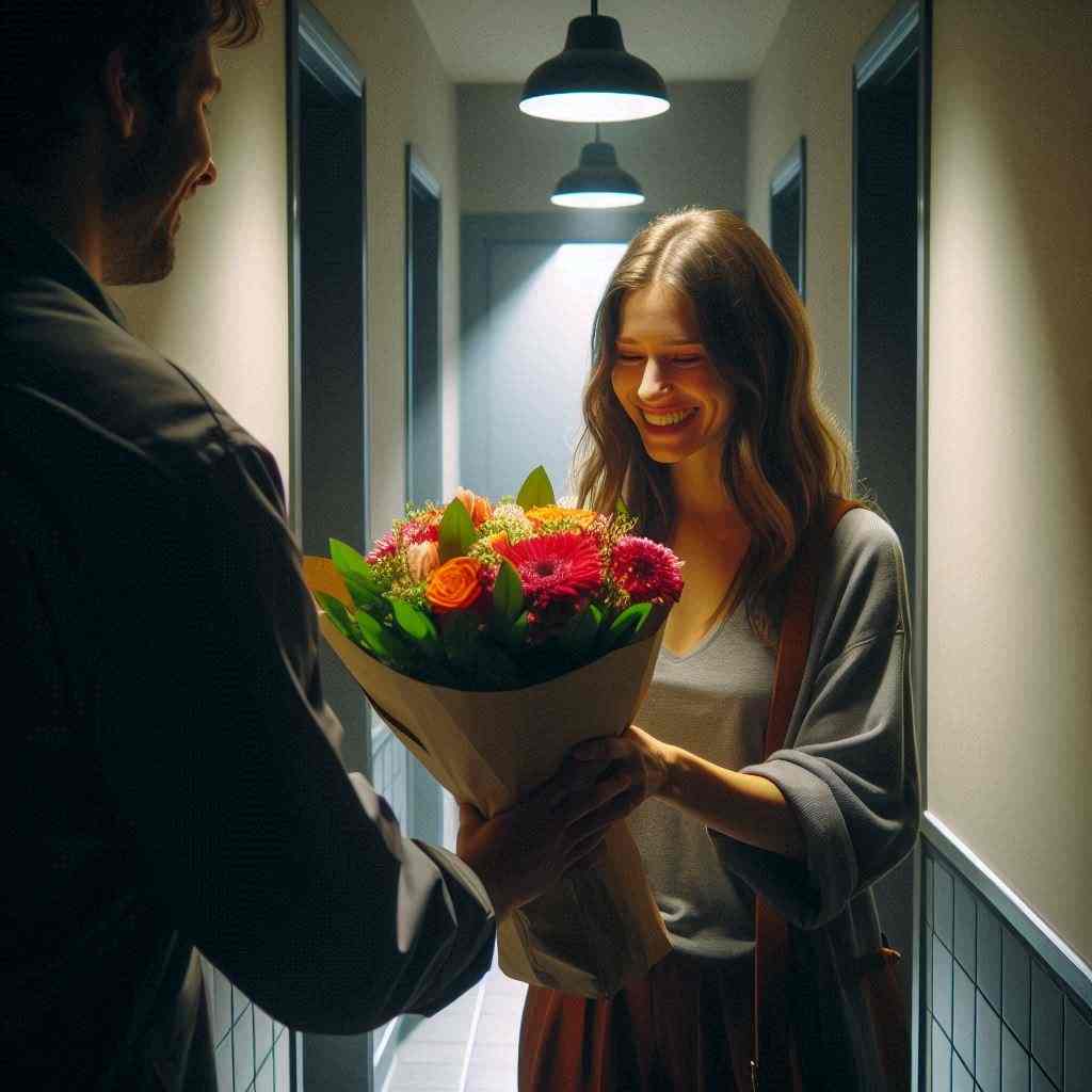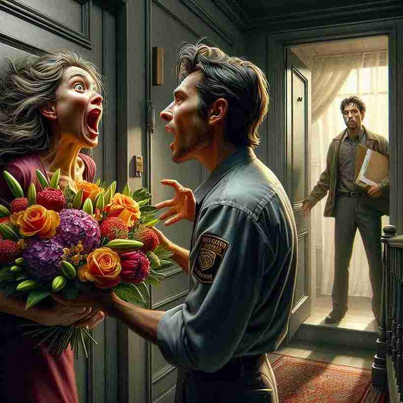 At that exact moment, my husband walked up the stairs, returning from work. He saw the scene — me at the door, the courier holding his clipboard, and our neighbor clutching the bouquet like a secret she didn’t want to let go of.