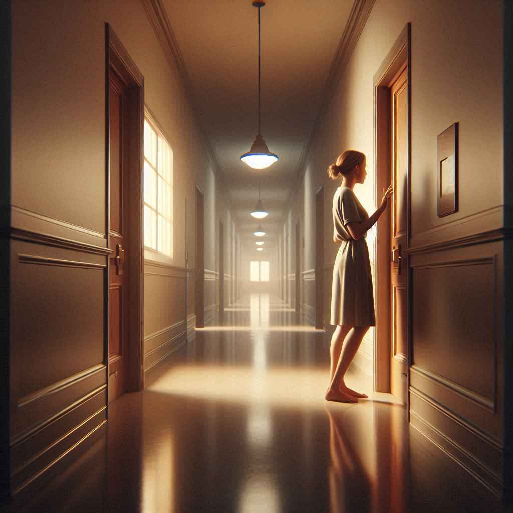 The hallway was quiet, lined with identical doors and faint echoes of student life—laughter in the distance, music playing softly somewhere, footsteps passing by. It was a world that felt both familiar and far removed from her own.