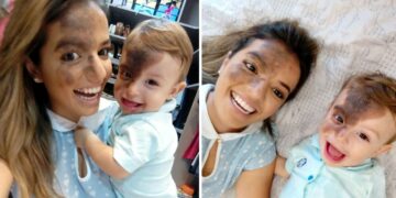 Mother paints her face to match her son’s birthmark so she can see what life is like for him. Her son’s birthmark was painted on...