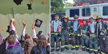 After being alerted to a nearby fire, students who had just graduated from Port Jefferson High School on Long Island, New York, put out a...