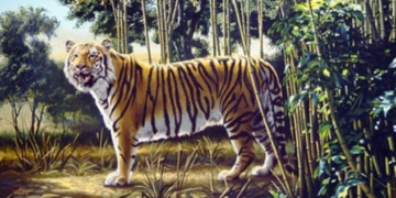 In this photograph, a majestic tiger stands at the edge of a wooded clearing. He appears to have just emerged from a bamboo grove and...